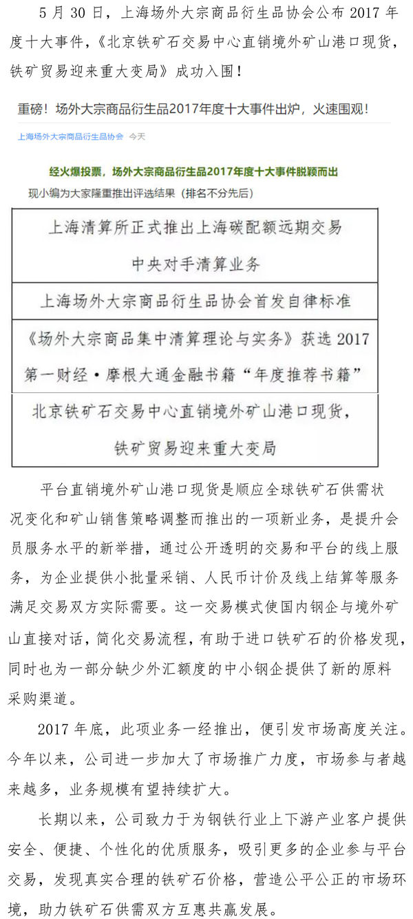 北鐵中心直銷境外礦山港口現貨業務入圍2017年度十大事件